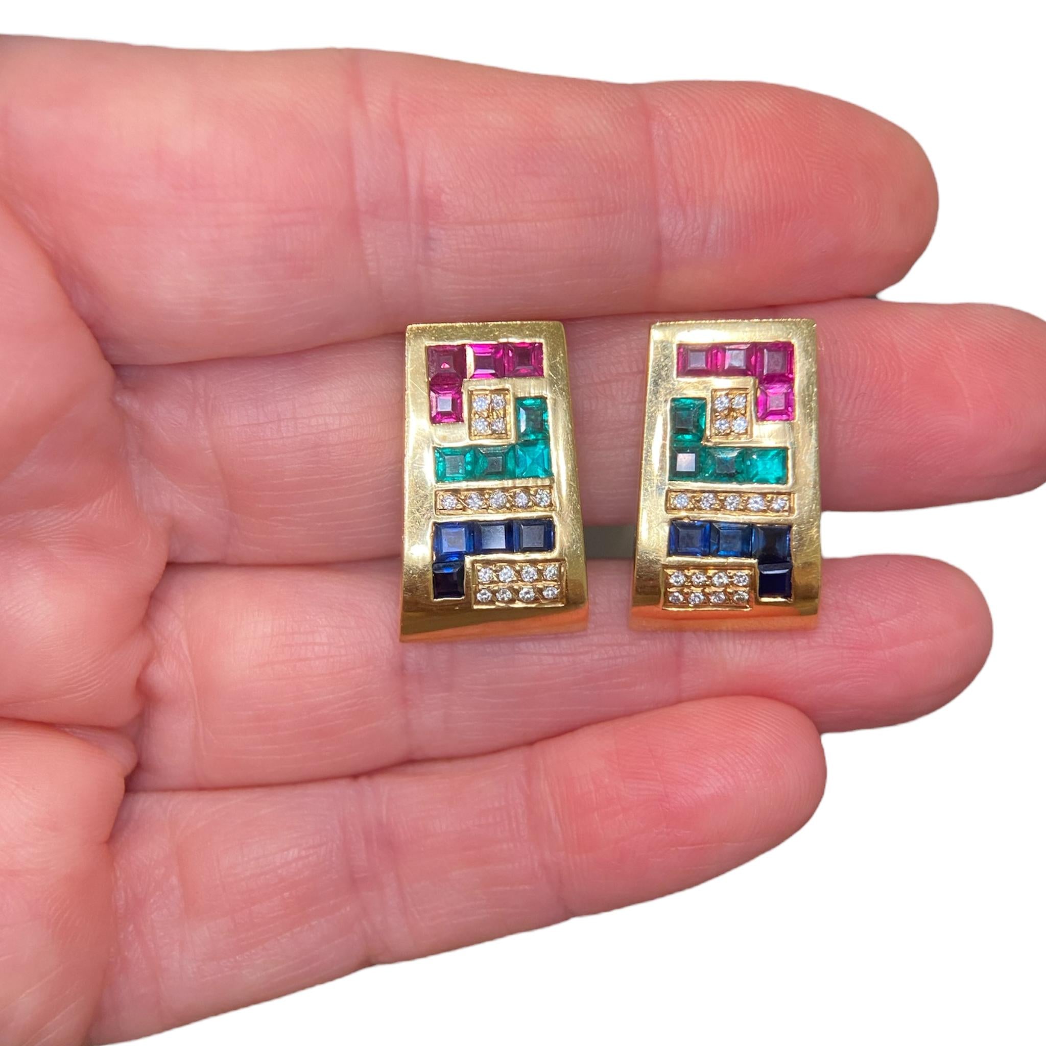 Crafted in 18K yellow gold, the earrings feature a geometric design with square cut rubies, blue sapphires and emeralds accented with diamonds. Folding post backings.