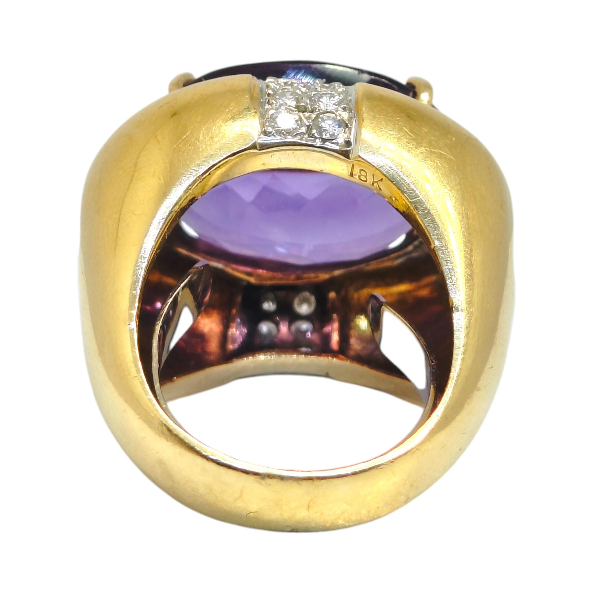 Vintage large cocktail ring crafted in 18K yellow gold, featuring a prominent oval-cut purple amethyst. The amethyst is flanked by brilliant-cut white diamonds, adding a touch of sparkle. The setting emphasizes the rich hue of the amethyst against the bright diamonds.