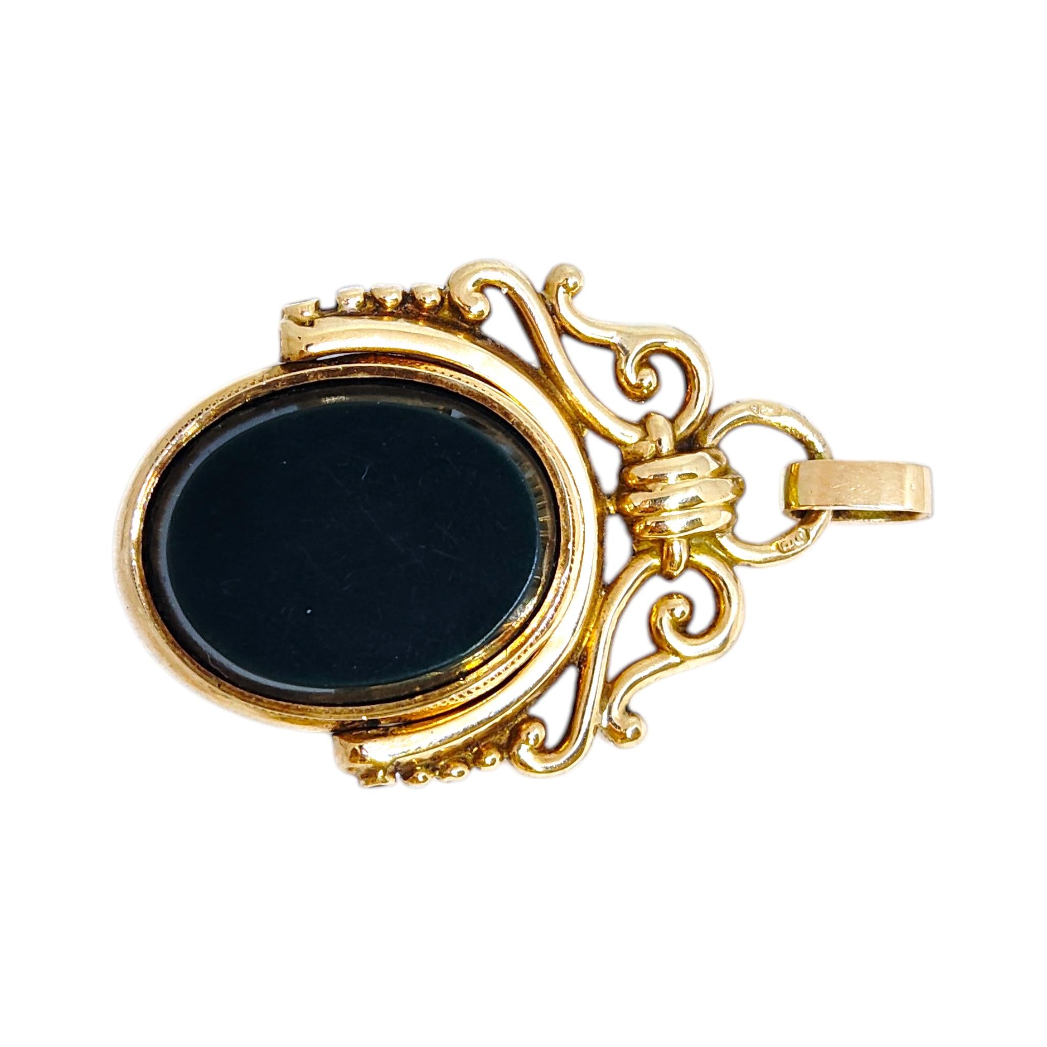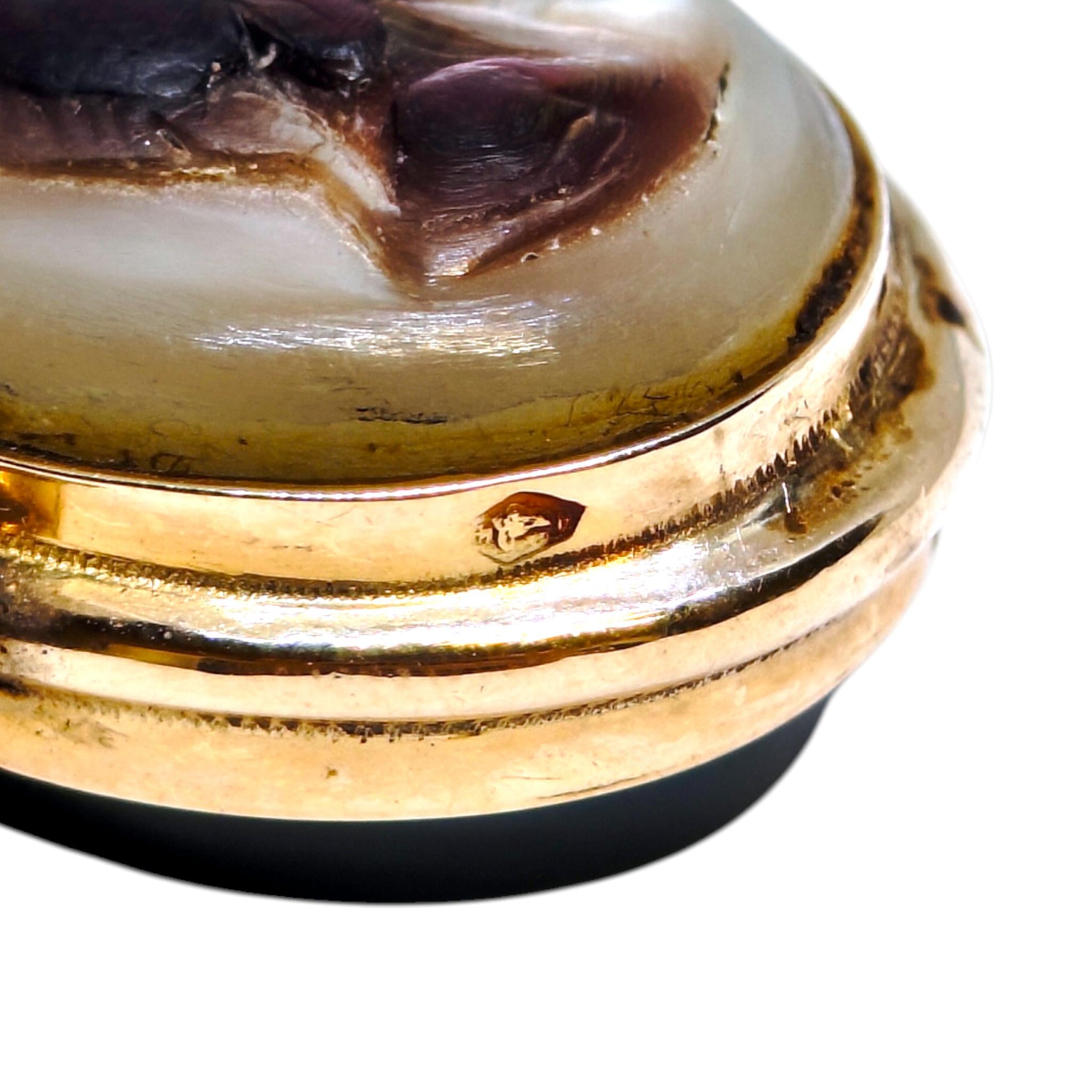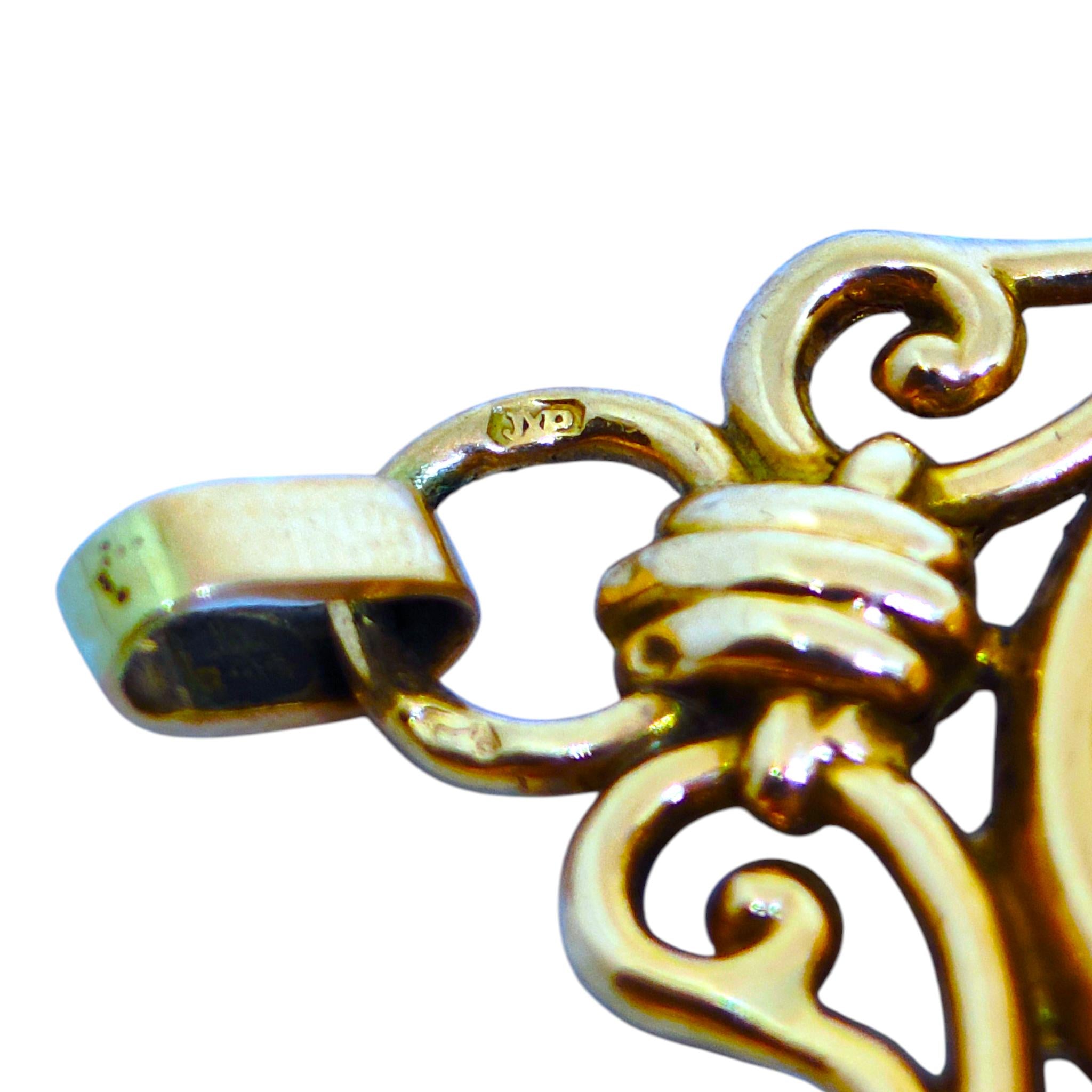 Antique Austro-Hungarian Empire pendant crafted in 14k yellow gold featuring a mother of pearl cameo with intricately carved profile, framed by ornate gold scrollwork. The opposite side is set with a flat green onyx cabochon. A polished bail allows for easy attachment to a chain.