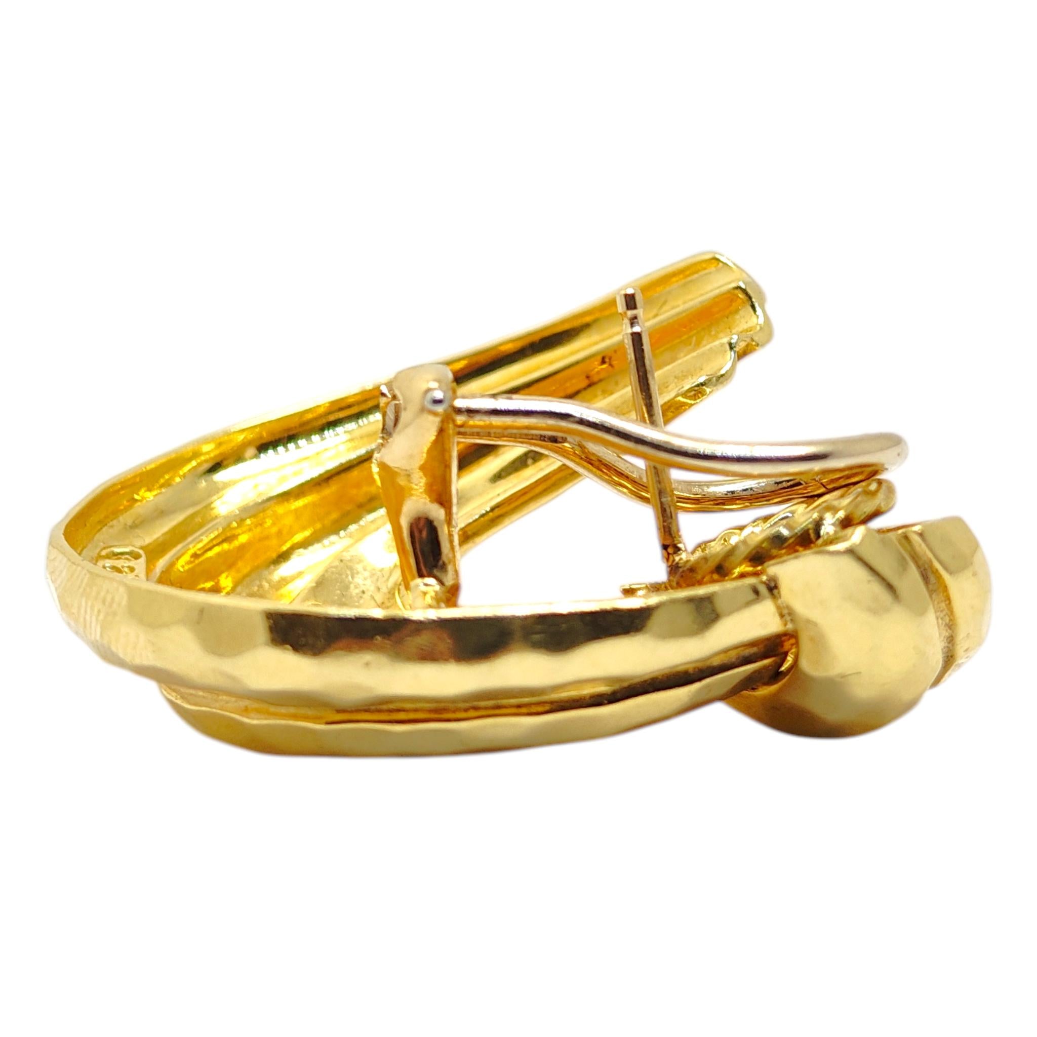 This exquisite pair of hoop earrings showcases the artistry and craftsmanship synonymous with Henry Dunay, a renowned figure in the jewelry world. Created in the vibrant setting of New York City during the 1990s, these earrings are a testament to Dunay's innovative design and attention to detail. Fashioned from solid 18 karat yellow gold, they feature Dunay's signature faceted patterns that play with light and texture, adding a dynamic elegance to the classic hoop silhouette. Designed as a left and right pair, they ensure a harmonious and balanced look when worn. The earrings are equipped with gold posts for pierced ears and omega backs, providing both comfort and security. These timeless pieces reflect the rich history and distinctive style of Dunay’s atelier, making them a cherished addition to any jewelry collection.