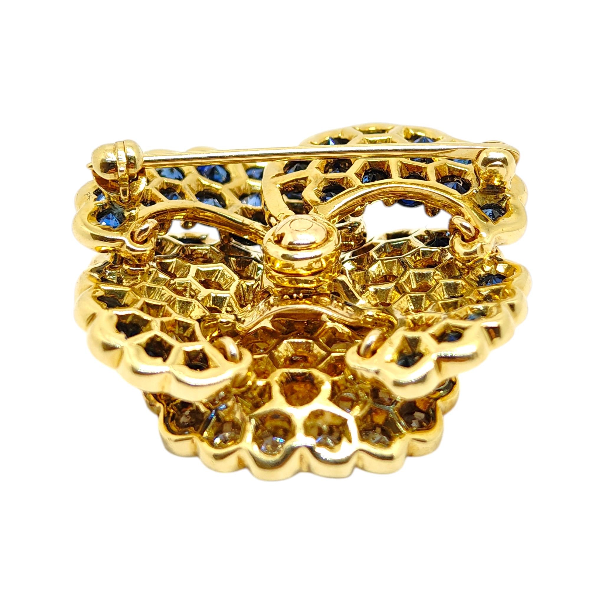 This stunning jewelry piece by Jean Vitau perfectly captures the pansy flower's elegance. The top petals feature vibrant sapphires, while a diamond sparkles at the center, surrounded by yellow sapphires for added warmth. Diamonds adorn the lower petal, all set in luxurious 18k yellow gold. It's a true showcase of Vitau's talent and artistic flair.