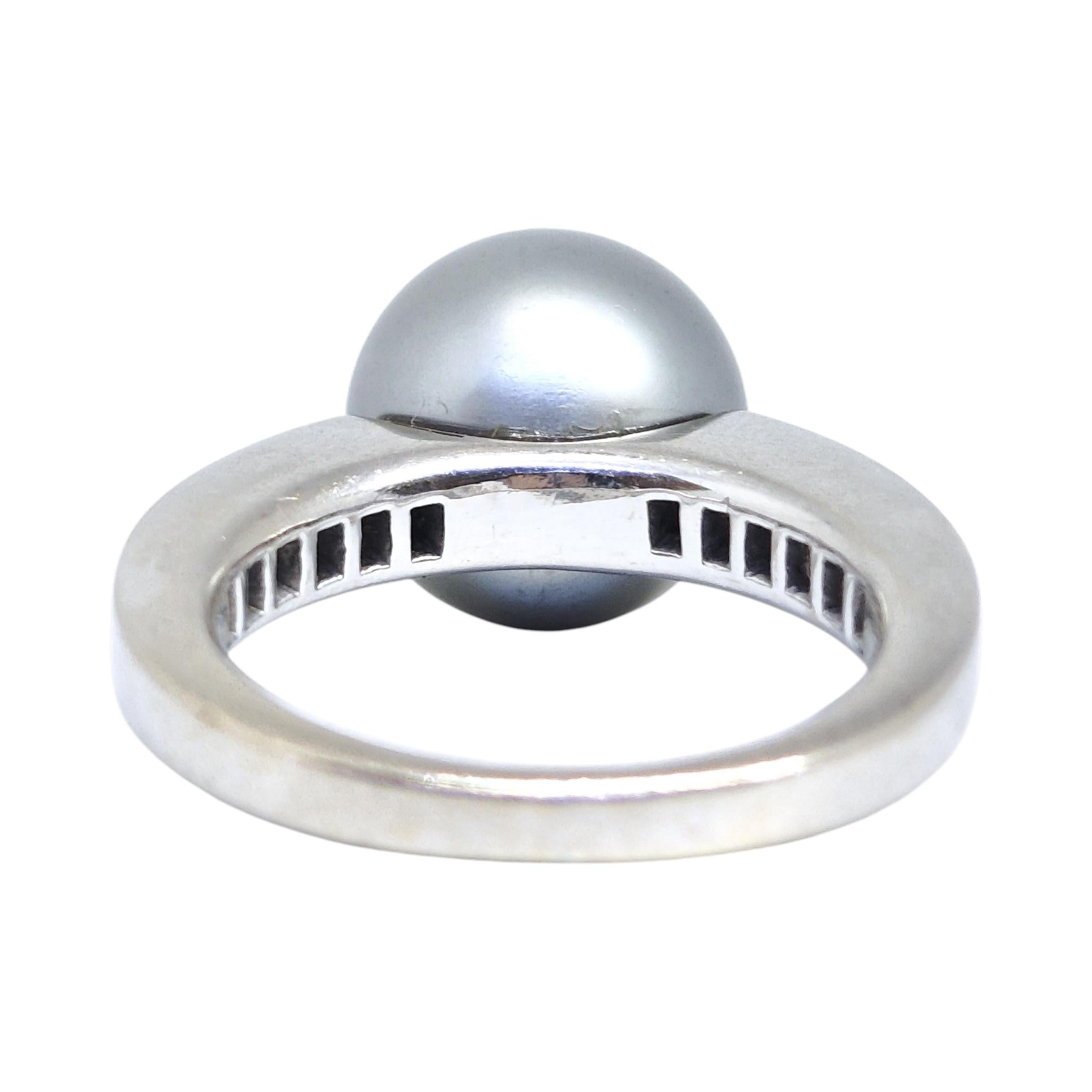 Mikimoto 18K white gold ring featuring a perfectly round gray Akoya cultured pearl as the centerpiece. The band is adorned with channel set princess-cut diamonds, offering a subtle sparkle.