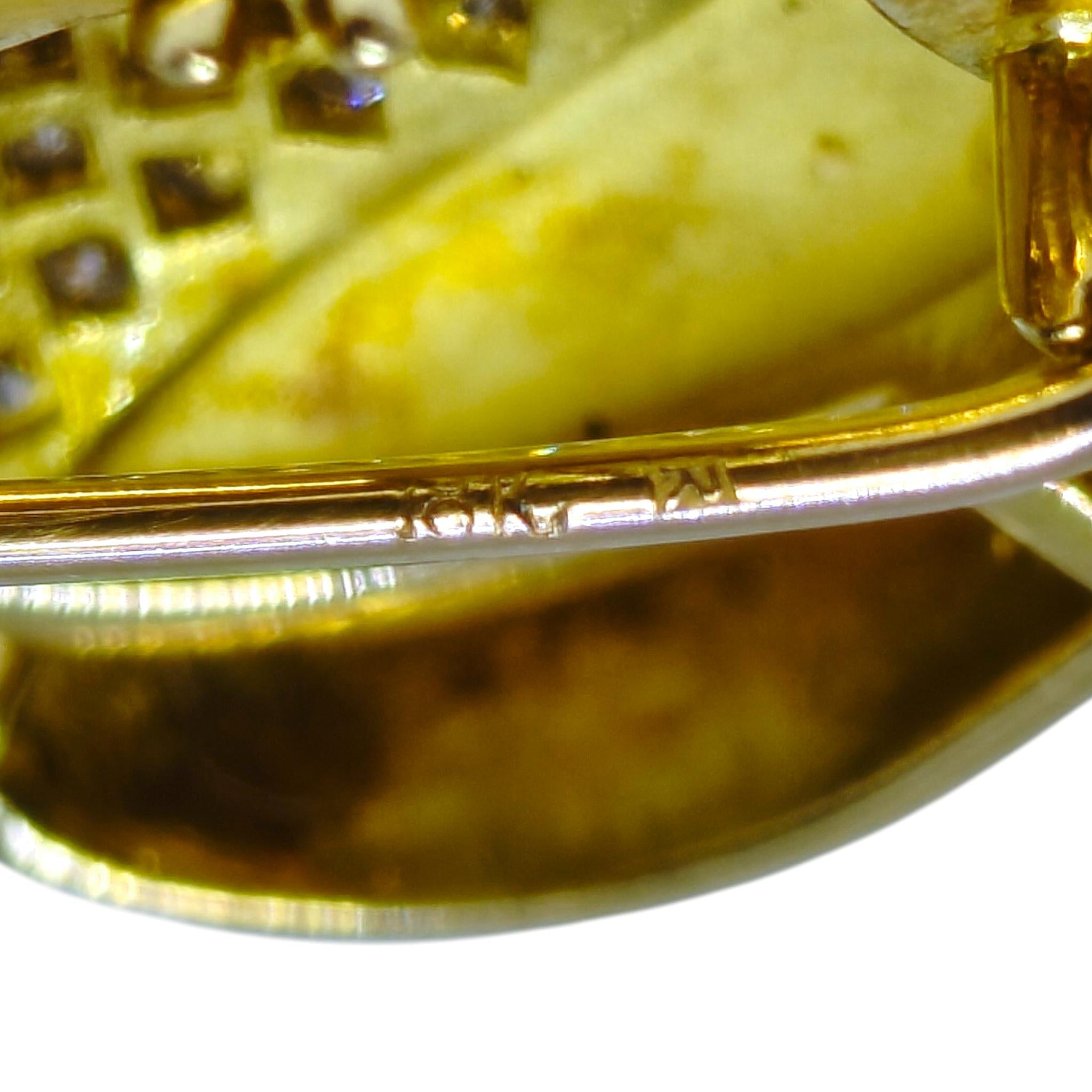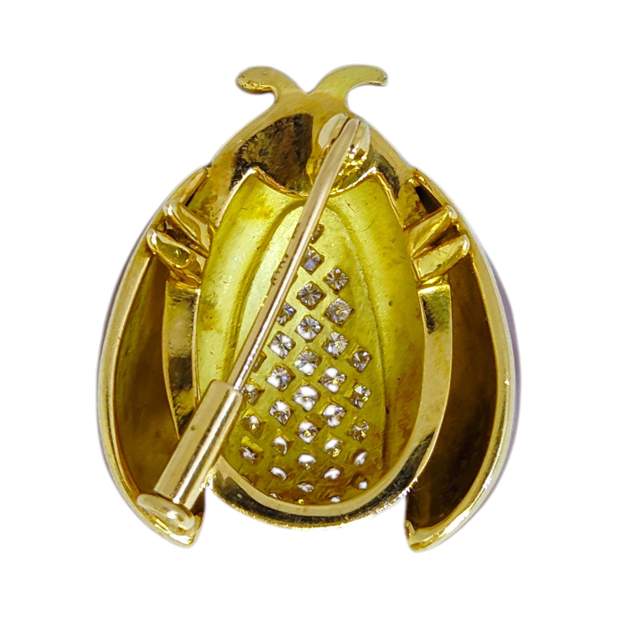 Vintage 18K yellow gold brooch in a ladybug design. The body is encrusted with diamonds and the wings are decorated with rich brownish red enamel with black spots. Purplish red garnet eyes. Polished gold accents outline the wings and head.