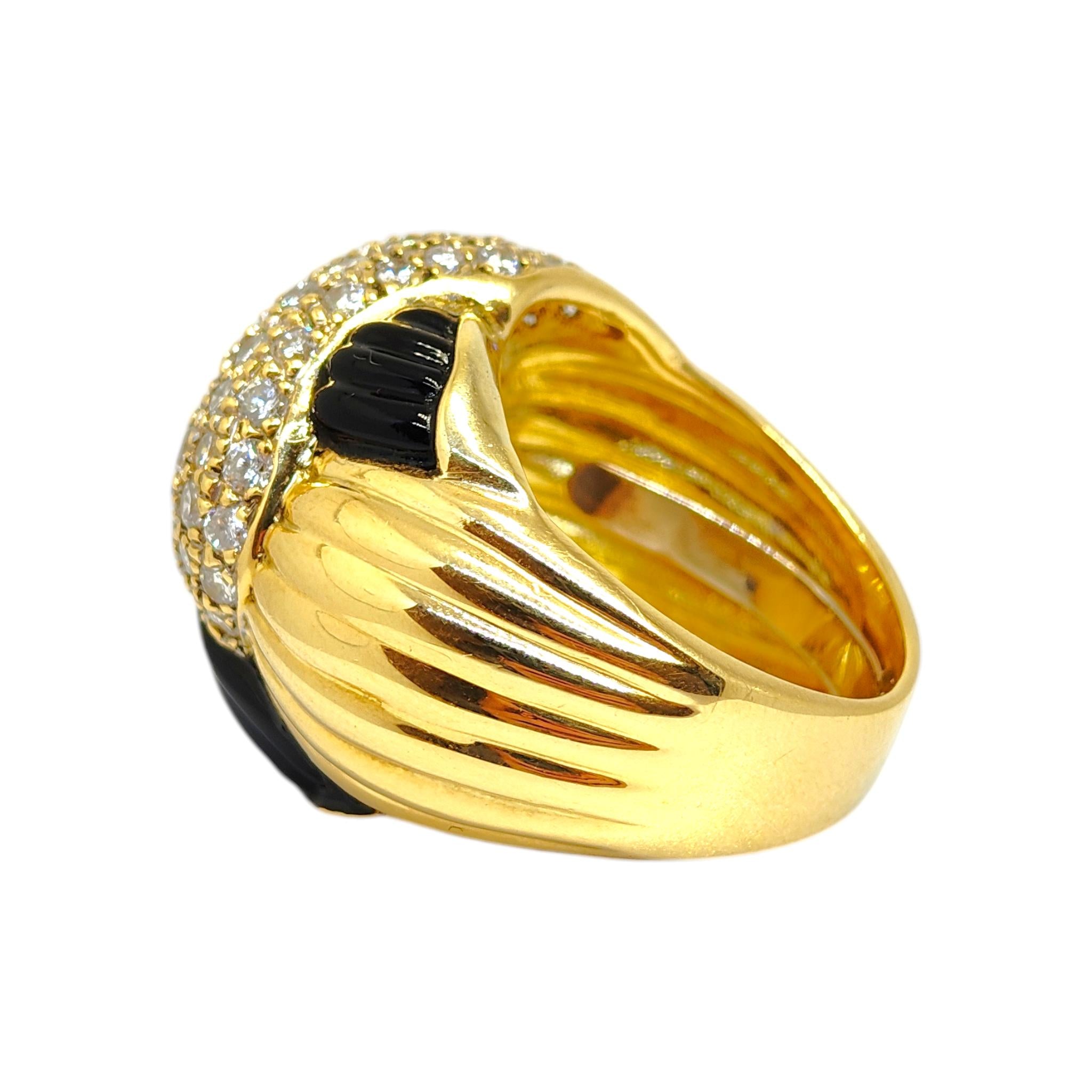 Vintage 18K yellow gold large domed cocktail ring with a stylized knot design, composed of pave set round brilliant cut diamonds set against fluted onyx and gold sections. Diamonds: 2.00ctw. Color: G-H, Clarity: VS1-VS2.