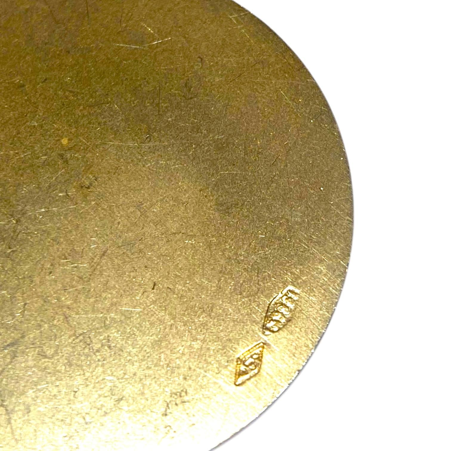Vintage Italian disc pendant crafted in 18k yellow gold. The design features an ornate fleur-de-lis motif, showcasing elegant curves with polished and textured finish.